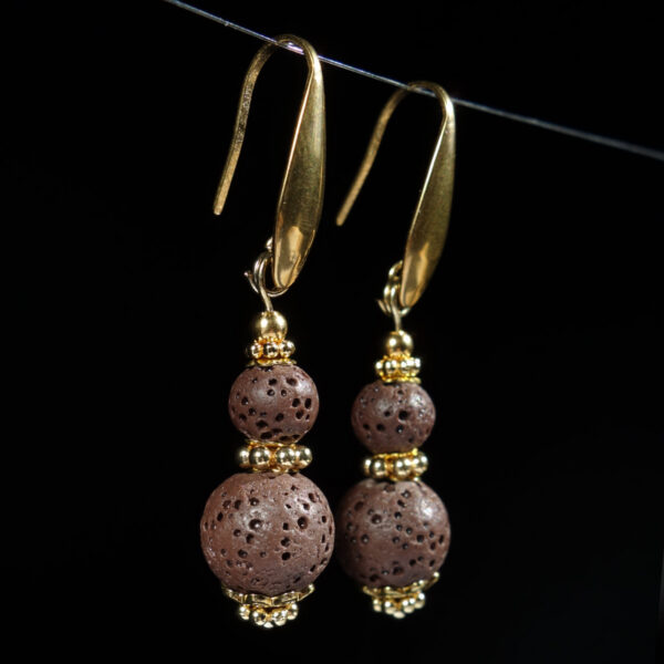 Cocoa Ember Veil Lava Stone Drop Earrings radiate grounded passion, their 6mm and 10mm dyed matte dark brown beads glowing with cocoa warmth. These earthy stones kindle stability and emotional depth, nurturing the spirit. Hypoallergenic 18k gold PVD-plated stainless steel findings ensure timeless elegance. Designed by Silvi Simberg for the Stellar Stainless 2025 Collection.